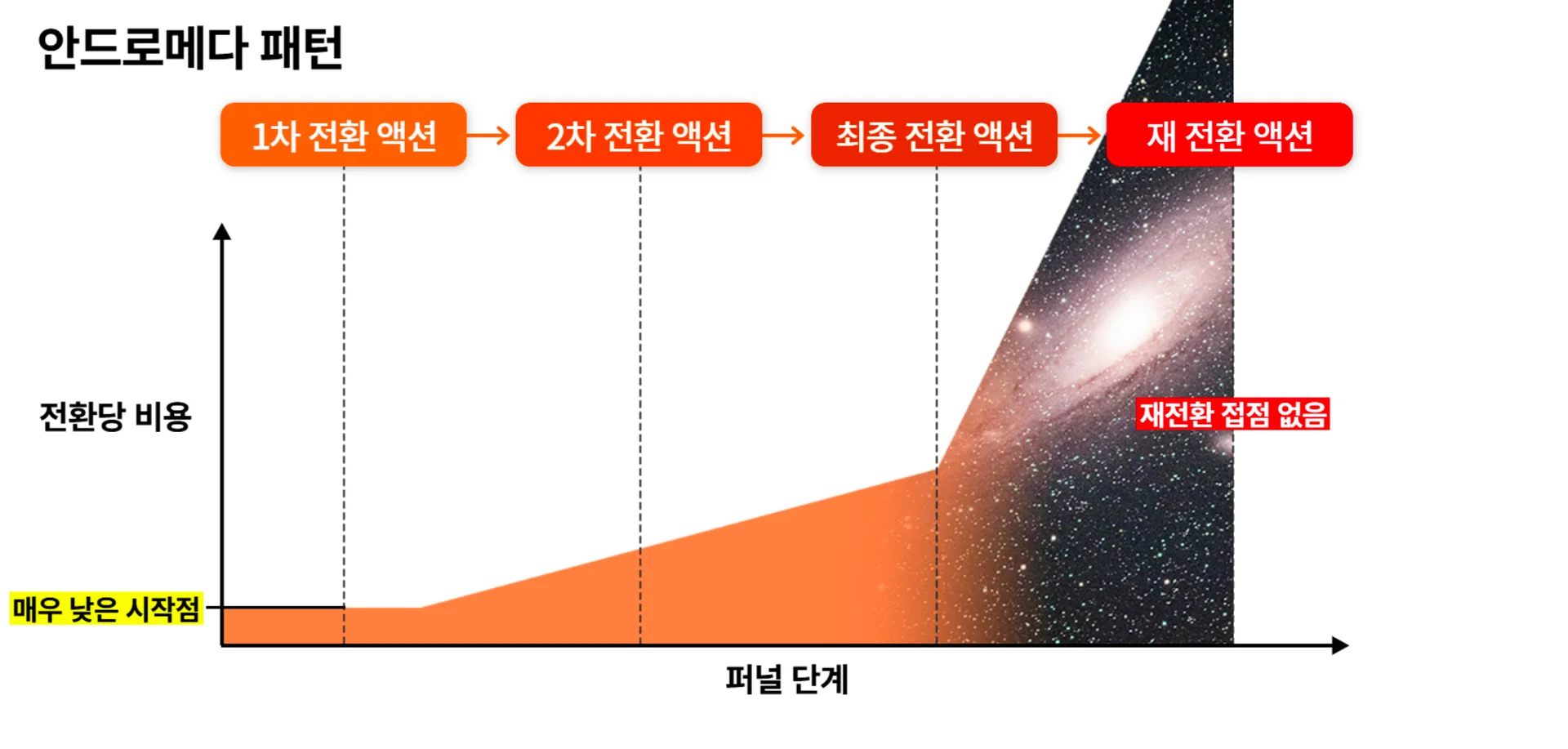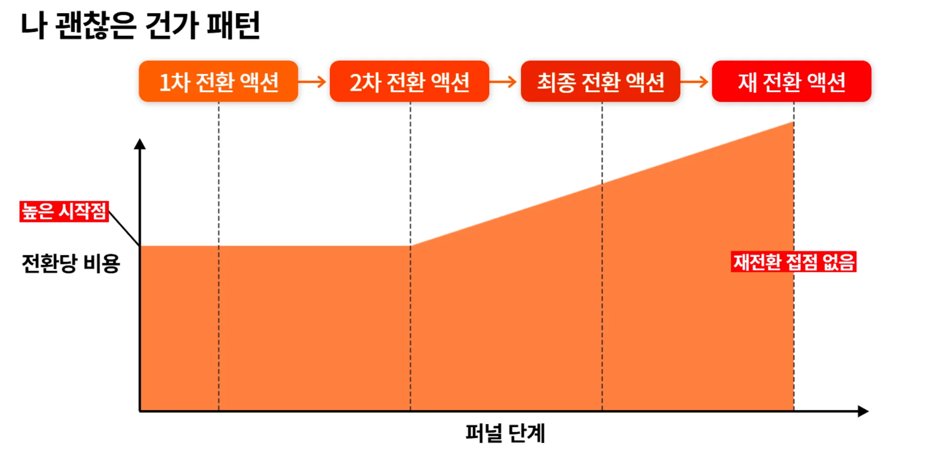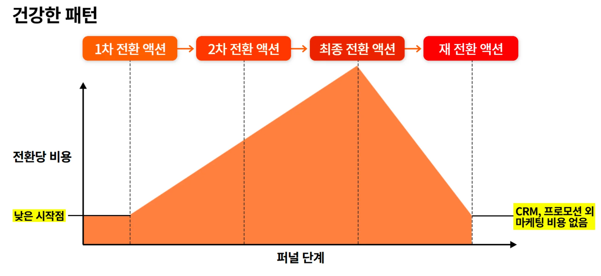 전환당 비용이 낮은 시작점에서 시작해서, 중간 단계에서 최고점을 찍은 후 재전환 단계에서는 비용이 현저히 낮아지는 모습을 보입니다.