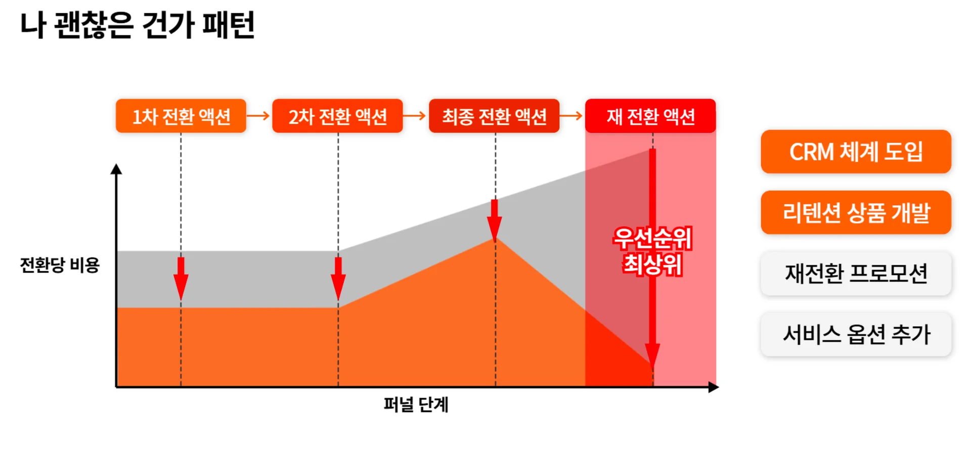 CRM 체계, 리텐션 상품, 재전환 프로모션, 서비스 옵션 추가 등을 하루 빨리 검토하여 실행해야 합니다.