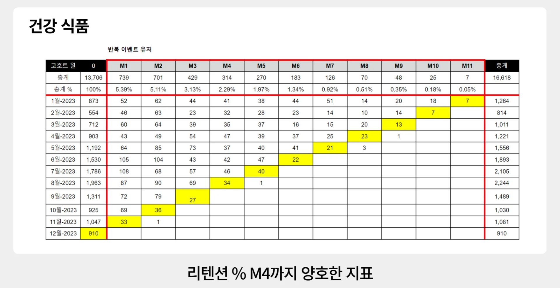 리텐션은 위 캡처처럼, 코호트별로 분석해야 합니다.